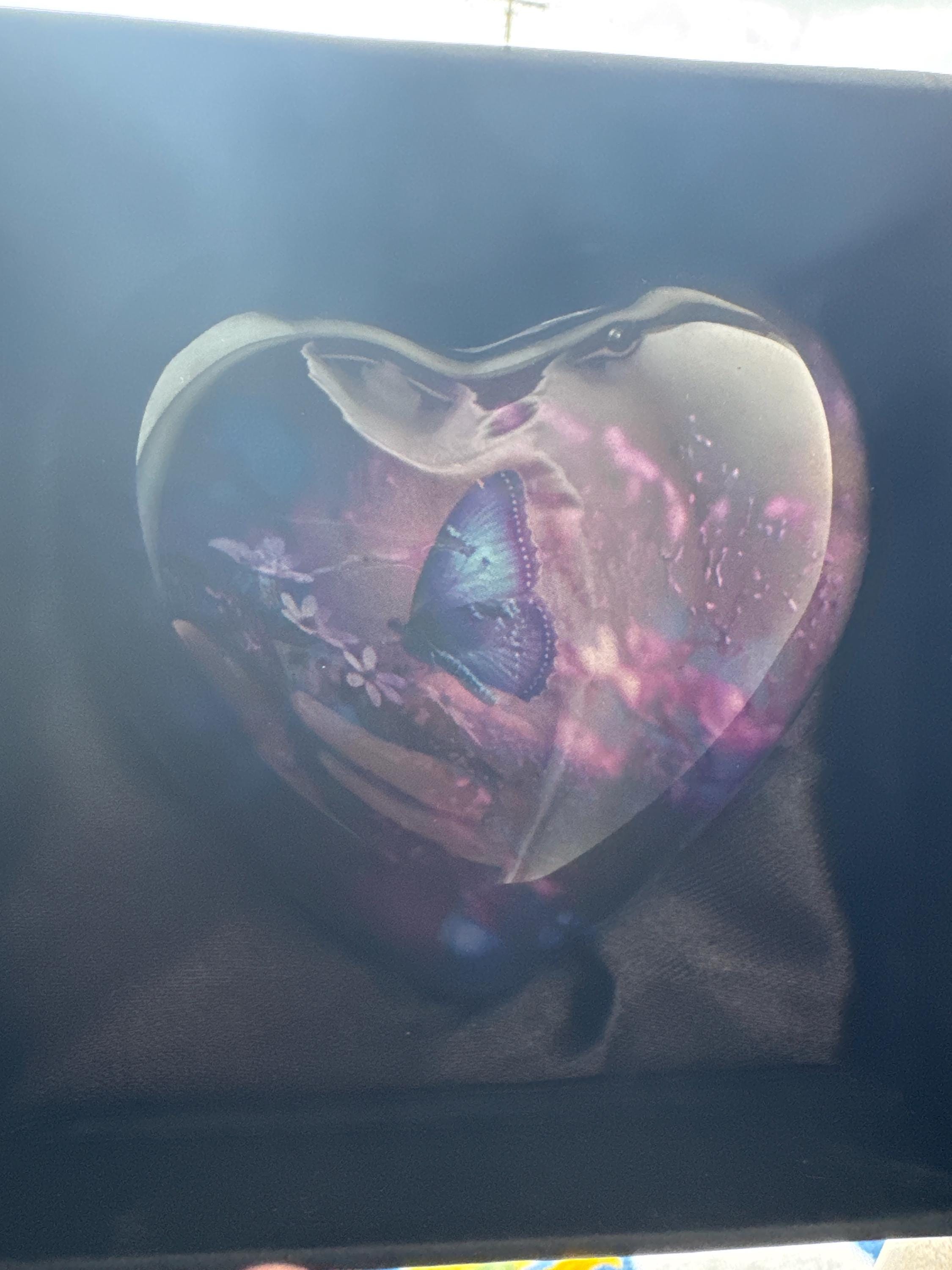 Celebrate the memory of your loved one with the Heart Shaped Blue Butterfly Memorial Urn in Black. This exquisite urn features a stunning blue butterfly resting on delicate purple flowers, symbolizing transformation, hope, and beauty. The heart shape, combined with the elegant black background, provides a meaningful and timeless tribute to your loved one.