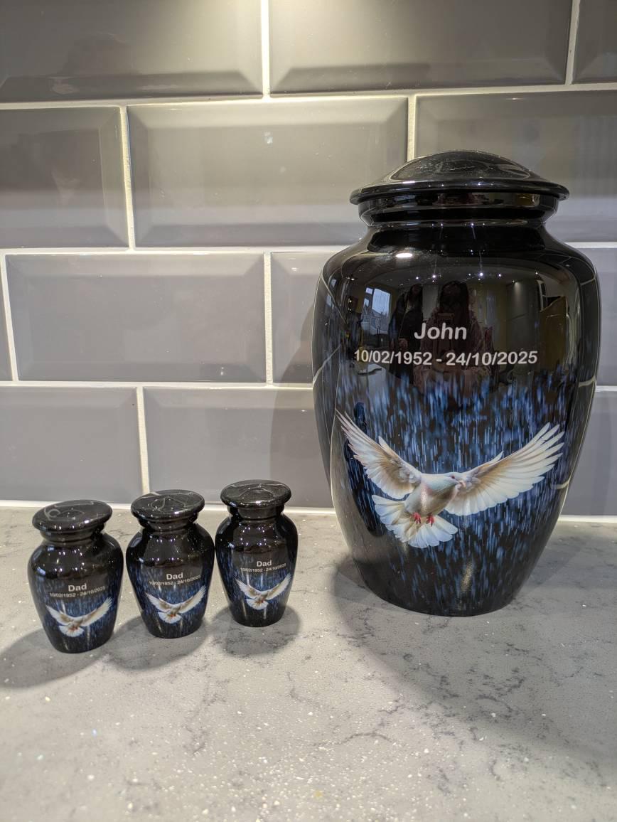 Artistic Design: The white dove in the rain illustration adds a serene and artistic touch, making it a perfect decorative urn for any setting.