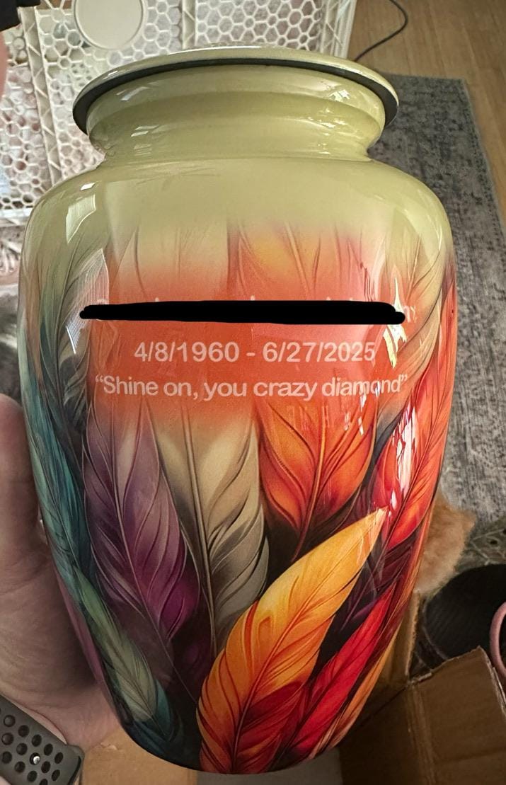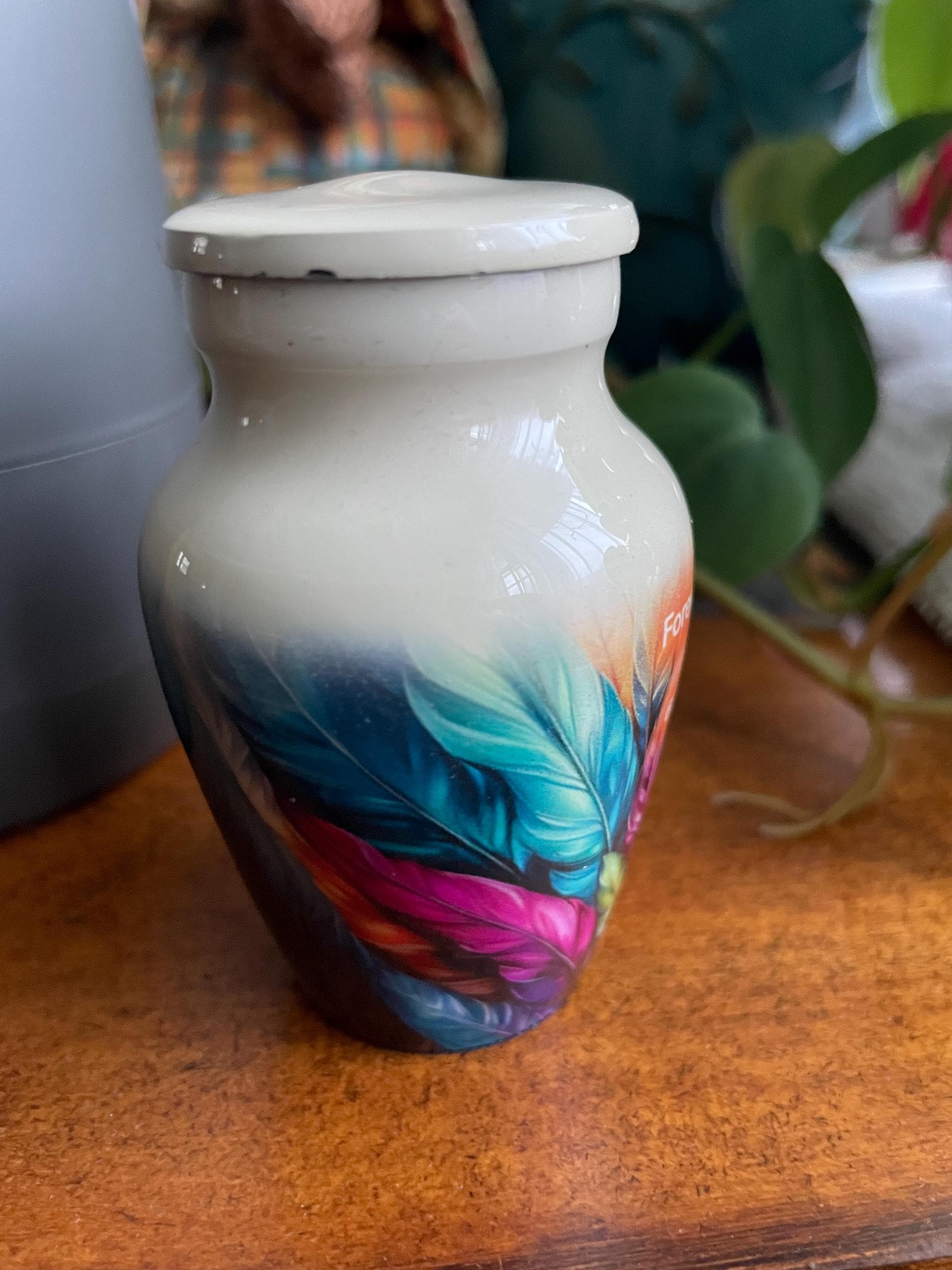 Introducing the Colorful Feather Pattern Cremation Urn for Human Ashes, a vibrant and unique way to honor the memory of your loved one. This urn features a stunning design of colorful feathers, making it a beautiful and eye-catching piece for any memorial space.